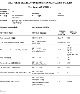 | finish | Finish:Dyed+W/R+TPU milky breathable membrane W/P10000mm MVP5000g/m2/D; Cuttable width:58" Weight:75gsm±5gsm |